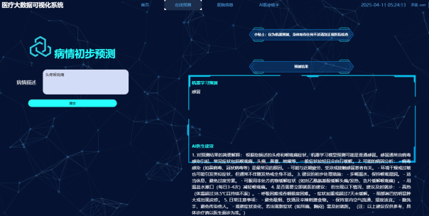 (1)症状自检与建议功能:患者可通过多级症状选择器输入不适体征,系统通过随机森林模型预判潜在疾病并生成诊断报告,同时调用大模型提供护理建议与就医指引。