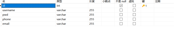 (1) user管理员信息表,主要用于存储用户的相关信息,如账号、邮箱、等基本信息。User信息表如表4-1所示。