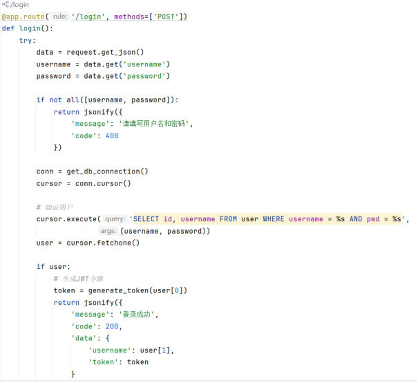 用户在前端提交用户名和密码后,系统通过POST请求将数据发送到登录接口。后端首先验证请求中是否完整包含用户名和密码字段,若任一字段缺失则立即返回参数错误提示。当数据完整时,程序会建立数据库连接,使用SQL查询核对用户凭证,通过精确匹配用户名和密码字段来确认用户身份。若数据库未找到对应记录,则返回认证失败信息。