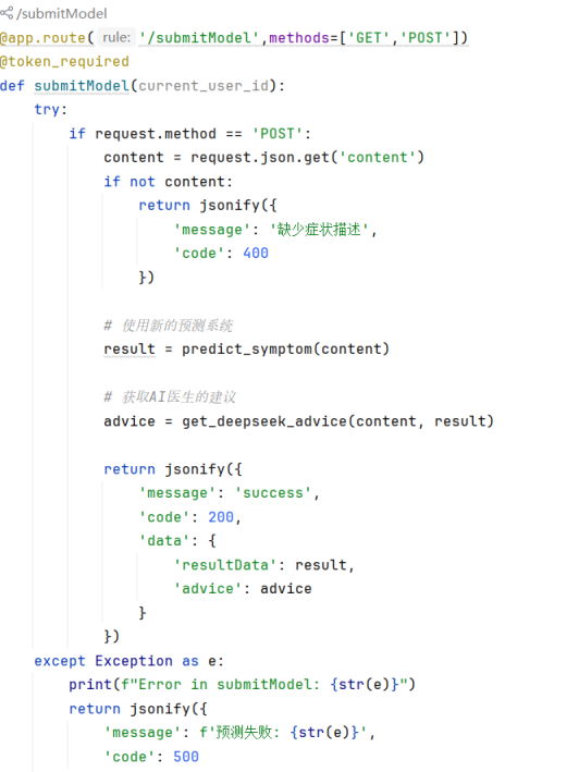 用户通过认证接口提交医疗症状数据后,系统启动双阶段智能处理流程。当调用症状预测接口时,后端首先验证请求头中的JWT令牌有效性,拦截未授权访问。接收POST请求后,系统严格检查症状描述文本的完整性,缺失关键内容时立即返回参数校验错误。通过验证的文本输入至预置的机器学习模型进行实时推理,随机森林算法基于训练特征库进行多维度模式匹配,输出疾病预测结果。此时系统同步触发医疗建议生成机制,将原始症状描述与模型预测结论组合成结构化提示模板,通过加密API通道向DeepSeek医疗大模型发起咨询请求。