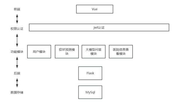 本项目主要有四个结构层次,分别是前端vue,后端flask,数据库MySQL和权限认证JWT,请参阅图4-1所示。