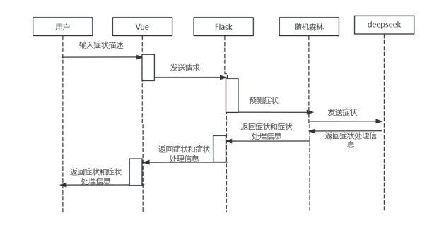 - 机器学习预测和大模型建议的主要流程是通过用户输入症状描述机器学习字段并将机器学习预测的症状发送给deepseek进行症状处理。详细时序图如图4-8所示。