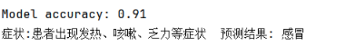 机器学习训练流程从连接医疗信息数据库开始,首先提取病例类型与症状描述数据,自动清洗文本并建立疾病类型标签映射体系。通过中文分词工具对症状描述进行语义切分,生成标准化词条序列。采用TF-IDF算法构建文本特征矩阵,设定最大维度控制特征空间规模。将数据集按比例划分为训练集与测试集后,运用随机森林算法进行多分类模型训练,配置决策树数量与随机种子参数。模型训练完成后进行交叉验证评估,输出分类准确率指标。系统将训练好的分类器、特征提取器及类型映射关系打包存储至专用目录,形成包含模型文件、向量化工具和标签字典的完整推理套件。当执行症状预测时,自动检测模型文件完整性,缺失时触发重新训练机制。预测阶段对输入文本进行同源分词处理,经特征空间映射后输入分类器,最终通过反向标签查询返回可读疾病类型。全过程实现从数据获取、特征工程到模型部署的自动化流水线,确保临床文本分类的持续学习与预测服务稳定性。训练结果如下图5-9所示: