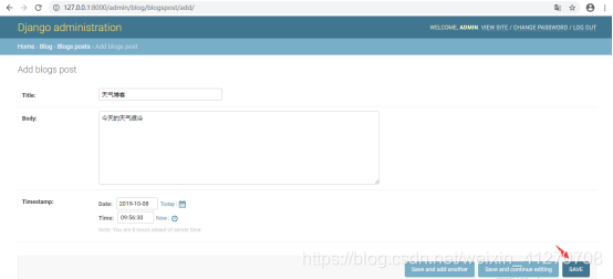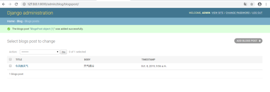 第五步:登录admin后台添加blog,再次启动项目,访问:http://127.0.0.1:8000/admin