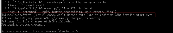 文件保存注意编码格式,推荐用utf8统一保存,格式不对,会报如下错误,也无法打开http://127.0.0.1:8000/blog/