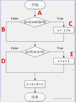 图中A、B、C、D、E分别表示路径,并且记第一个判断为P1,第二个判断为P2;一共有4个条件,我们记C1:a>1、C2:b=0、C3:a=5、C4:c>1,接下来开始分析。