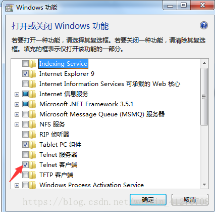 3)确保“Telnet客户端”是被勾选状态,然后点击确定按钮