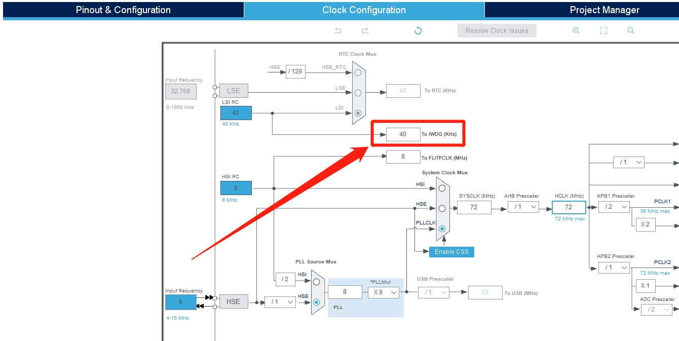 - 独立看门狗有自己的时钟,如下图:我的时钟是40KHZ