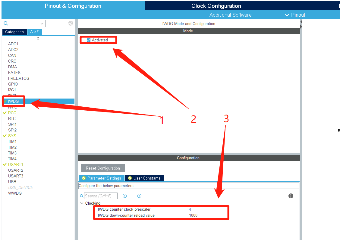 1选择独立看门狗2选中Activated3设置分频值psc和重装载值reload