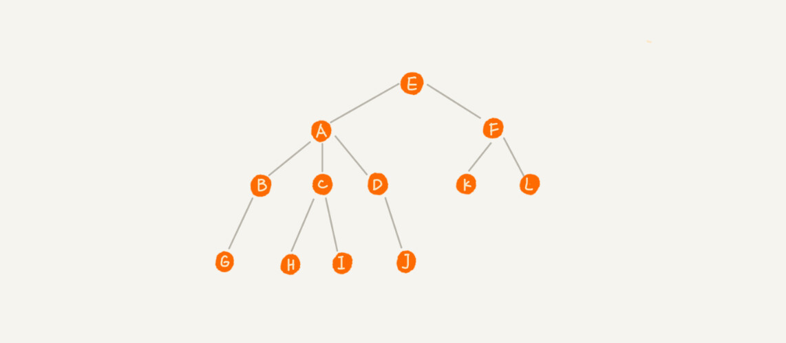 比如下面这幅图,A 节点就是 B 节点的父节点,B 节点是 A 节点的子节点。B、C、D 这三个节点的父节点是同一个节点,所以它们之间互称为兄弟节点。我们把没有父节点的节点叫作根节点,也就是图中的节点 E。我们把没有子节点的节点叫作叶子节点或者叶节点,比如图中的 G、H、I、J、K、L 都是叶子节点。