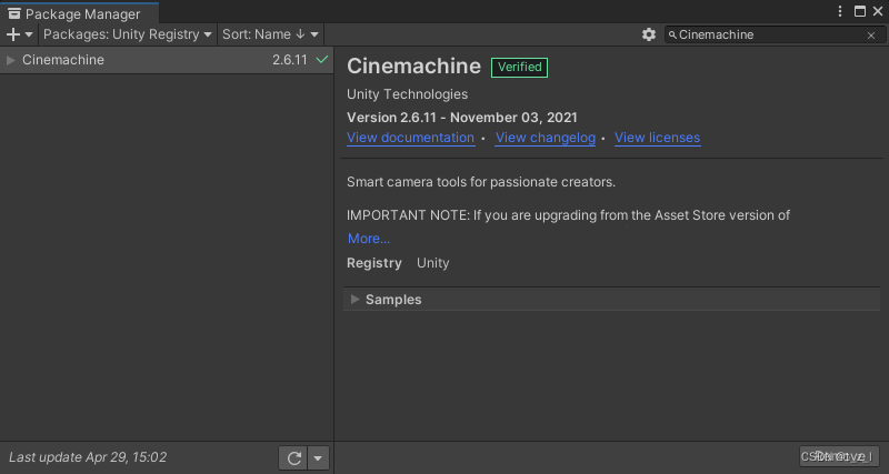 打开 window/Packge Manager 窗口,搜索cinemachine,点击安装