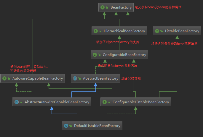 其中BeanFactory 作为最顶层的一个接口类,它定义了IOC 容器的基本功能规范,BeanFactory 有三个重要的子类:ListableBeanFactory、HierarchicalBeanFactory 和AutowireCapableBeanFactory。但是从类图中我们可以发现最终的默认实现类是DefaultListableBeanFactory,它实现了所有的接口。那为何要定义这么多层次的接口呢?查阅这些接口的源码和说明发现,每个接口都有它使用的场合,它主要是为了区分在Spring 内部在操作过程中对象的传递和转化过程时,对对象的数据访问所做的限制。例如ListableBeanFactory 接口表示这些Bean 是可列表化的,而HierarchicalBeanFactory 表示的是这些Bean 是有继承关系的,也就是每个Bean 有可能有父Bean。AutowireCapableBeanFactory 接口定义Bean 的自动装配规则。这三个接口共同定义了Bean 的集合、Bean 之间的关系、以及Bean 行为