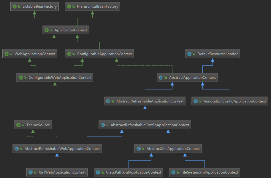 IOC 容器的初始化包括BeanDefinition 的Resource 定位、加载和注册这三个基本的过程。我们以ApplicationContext 为例讲解,ApplicationContext 系列容器也许是我们最熟悉的,因为Web 项目中使用的XmlWebApplicationContext 就属于这个继承体系,还有ClasspathXmlApplicationContext等,其继承体系如下图所示: