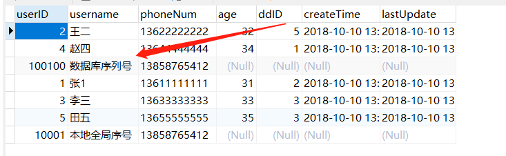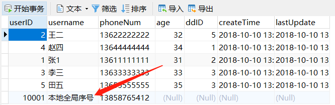 注:sequnceHandlerType 需要配置为 0,表示使用本地文件方式。 使用示例:insert into users(userID,username,phoneNum) values(next value for MYCATSEQ_GLOBAL,‘本地全局序号’,'13858765412'); 缺点:当 MyCAT 重新发布后,配置文件中的 sequence 会恢复到初始值。 优点:本地加载,读取速度较快。看结果: