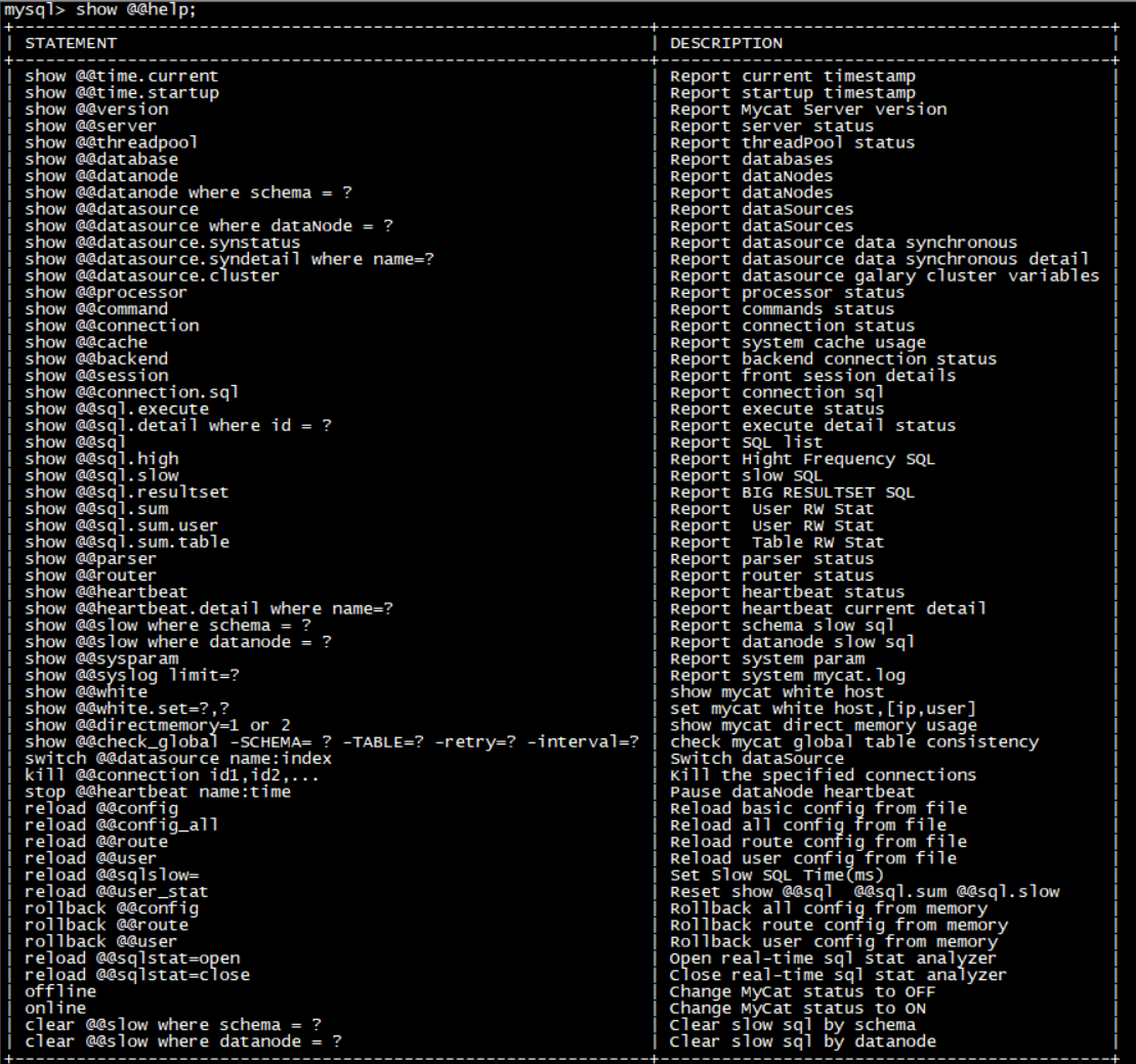 最后来看以下命令行监控工具:使用命令 mysql -uroot -p123456 -P9066 -h 192.168.254.138 这里的信息都是 mycat 的信息。进入控制台输入 show @@help; 查看命令: