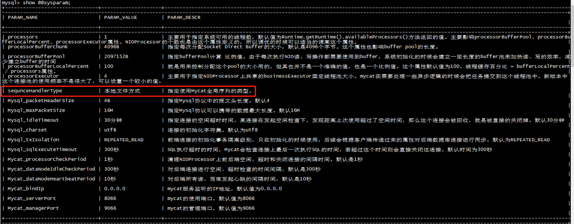 1)sequnceHandlerType 属性 :指定使用 Mycat 全局序列的类型。0 为本地文件方式,1 为数据库方式,2 为时间戳序列方式,3 为分布式 ZK ID 生成器,4 为 zk 递增 id 生成。 从 1.6 增加 两种 ZK 的全局 ID 生成算法。