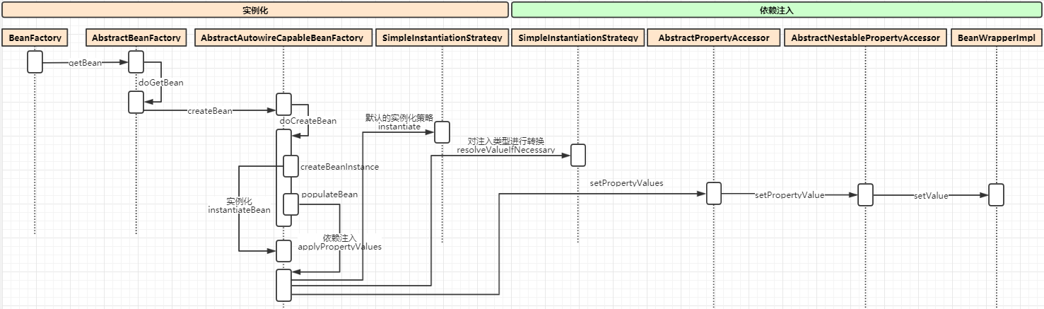 通过上面的代码分析,我们明白了Spring 是如何将引用类型,内部类以及集合类型等属性进行解析的,属性值解析完成后就可以进行依赖注入了,依赖注入的过程就是Bean 对象实例设置到它所依赖的Bean对象属性上去。而真正的依赖注入是通过bw.setPropertyValues()方法实现的,通过AbstractPropertyAccessor 的 setPropertyValues 转到AbstractNestablePropertyAccessor 的setPropertyValue。该方法也使用了委托模式, 在BeanWrapper 接口中至少定义了方法声明, 依赖注入的具体实现交由其实现类BeanWrapperImpl 来完成,下面我们就分析依BeanWrapperImpl 中赖注入相关的源码。