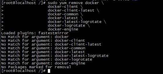 sudo yum remove docker \ docker-client \ docker-client-latest \ docker-common \ docker-latest \ docker-latest-logrotate \ docker-logrotate \ docker-engine