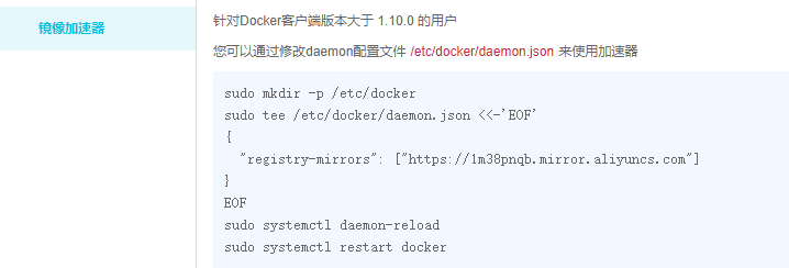 sudo mkdir -p /etc/docker sudo tee /etc/docker/daemon.json <<-'EOF' { "registry-mirrors": ["https://1m38pnqb.mirror.aliyuncs.com"] } EOF sudo systemctl daemon-reload sudo systemctl restart docker