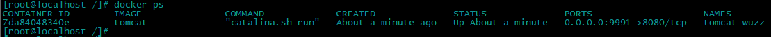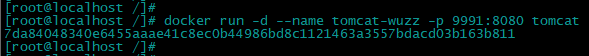 3.创建一个名字叫 tomcat-wuzz 的tomcat容器,且后台运行 将其默认端口8080 映射到centos系统的 9991 端口上。
