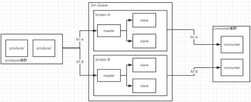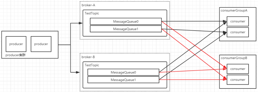 站在topic的角度来看看消息是如何分发和处理的,假设有两个master节点的集群,创建了一个TestTopic,并且对这个topic创建了两个队列,也就是分区。消费者定义了两个分组,分组的概念也是和kafka一样,通过分组可以实现消息的广播。