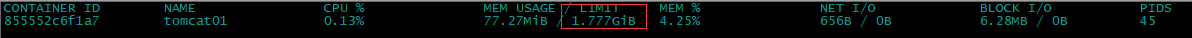我们会发现他的内存占用的LIMIT这里居然能达到1.777个G,但是很显然我们知道他不需要这么大的内存 ,那么我们需要去限制他,根据自己的监控状态来确定他的内存配比。
