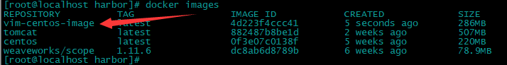 7.查看镜像列表,并且基于"vim-centos-image"创建新的容器 docker run -d -it --name my-vim-centos vim-centos-image