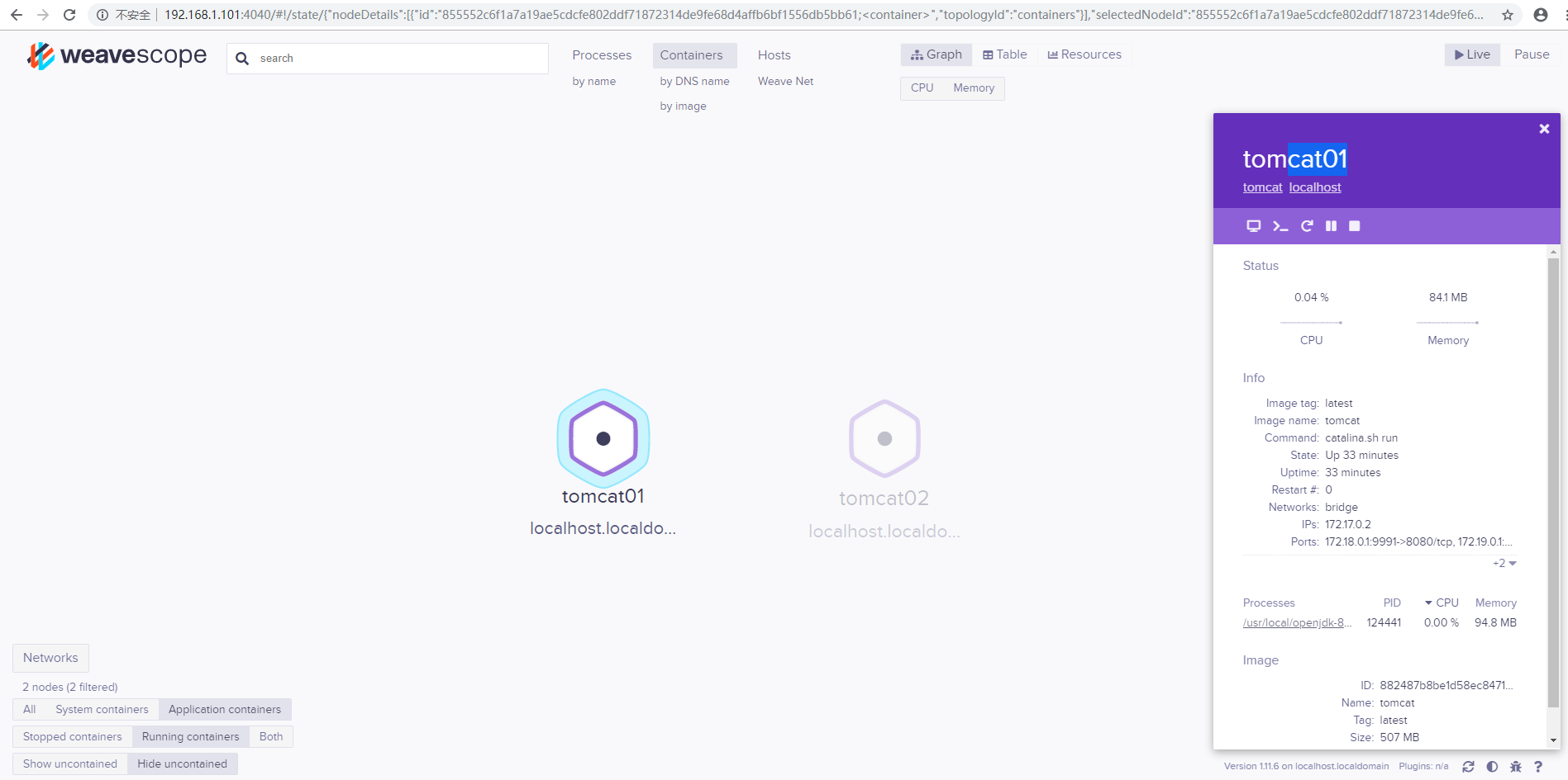 我们还可以通过官方推荐的图形化界面来看到我们的容器运行情况,资源利用情况,https://github.com/weaveworks/scope 只需要3个步骤