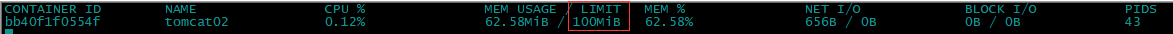 我们通过 docker run -d --memory 100M --name tomcat02 tomcat 来创建下一个容器 ,再查看其状态: