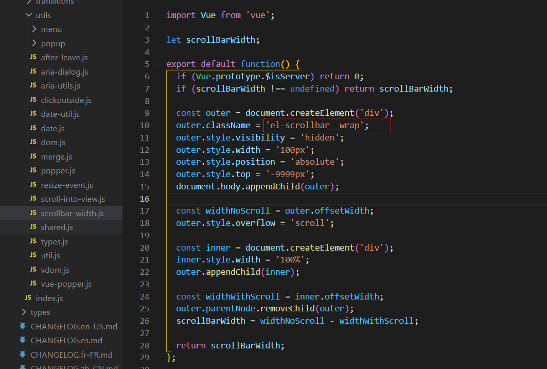 从源码中可以看出,gutterWidth的计算是通过在body创建一个el-scrollbar__wrap类的div,在el-scrollbar__wrap通过设置样式scroll,再里面引入子级div,通过父子级的offsetWidth计算出scroll的宽度是多少,而scroll的宽度实际上是全局的scroll宽度,所以导致我们在组件局部定义scroll宽度会出现留白。