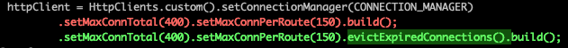 不看不知道,一看吓一跳,从 16:00 开始应用中创建的线程居然每时每刻都在上升,一直到 3w 左右,重启后(蓝色箭头),线程也一直在不断增长),正常情况下的线程数是多少呢,600!问题找到了,应该是在下午 16:00 左右发了一段有问题的代码,导致线程一直在创建,且创建的线程一直未消亡!查看发布记录,发现发布记录只有这么一段可疑的代码 diff:在 HttpClient 初始化的时候额外加了一个 evictExpiredConnections 配置