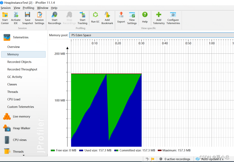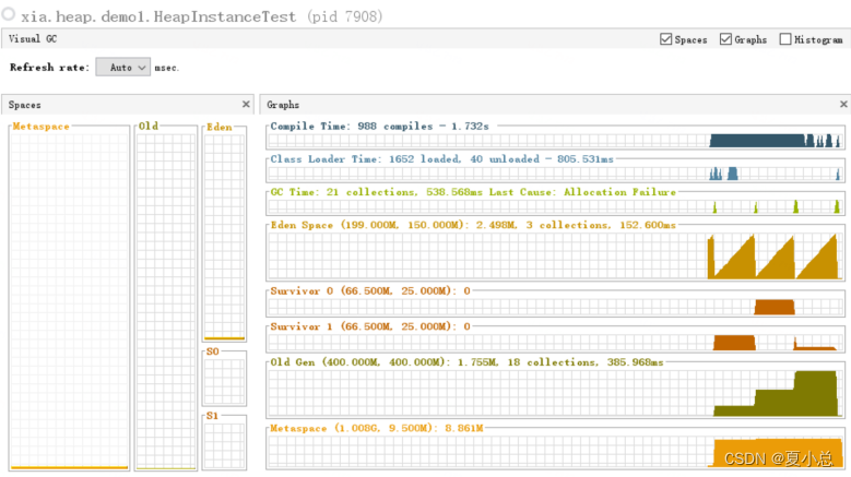 - (HeapDemo/HeapDemo1 jvisualvm)Java 堆区在 JVM 启动的时候即被创建,其空间大小也就确定 了 。是 JVM 管理的最大一块内存空间。
