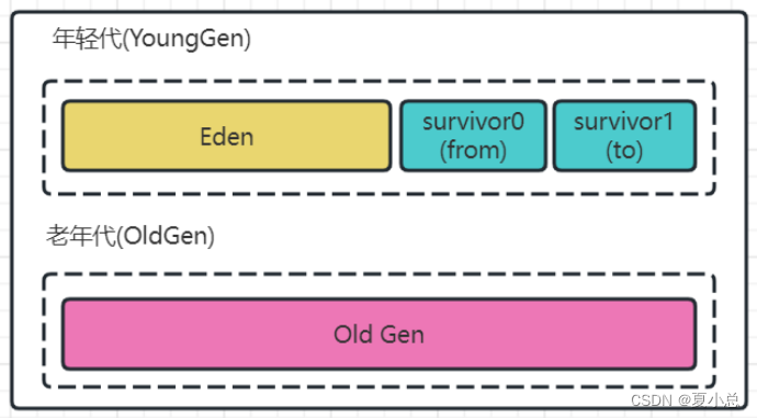 - 其中年轻代又可以划分为Eden空间、 Survivor0空间和Survivor1空间(有时也叫做from区、 to区)。