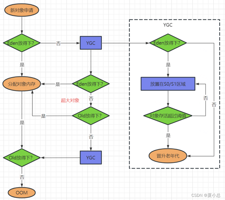 由Eden区 survivor space0 (From Space) 区向survivor space1(To Space) 区复制时, 对象大小大于To Space可用内存, 则把该对象转存到老年代, 且老年代的可用内存小于该对象大小