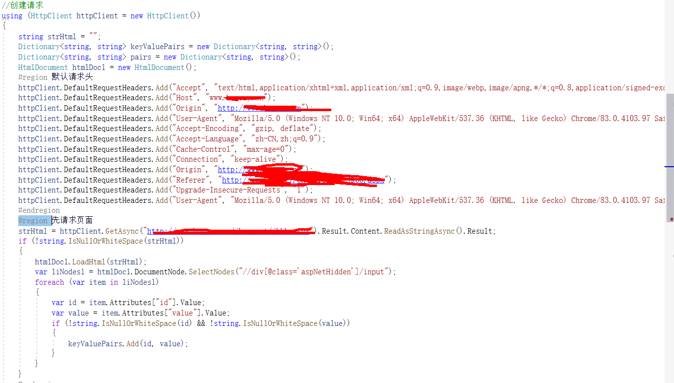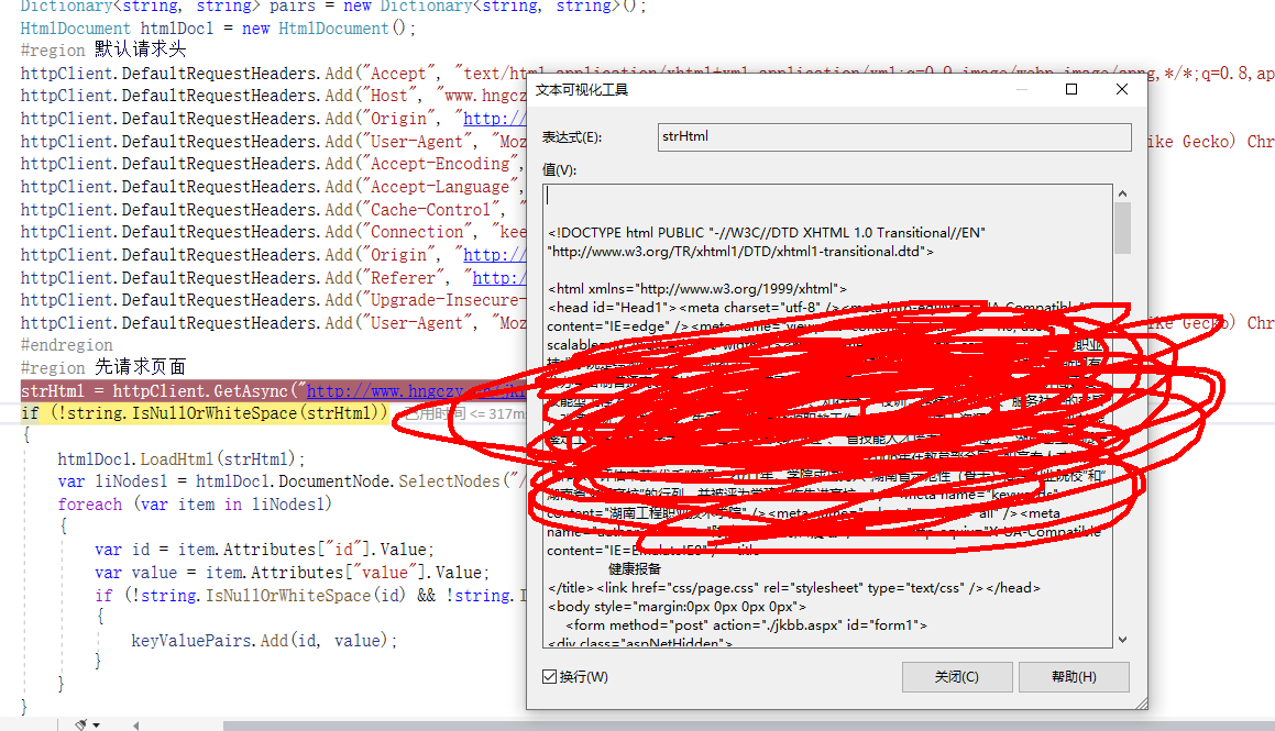 2、首先我们需要模拟用户向报备网页发起请求这里我使用的是HttpClient 对象发起请求,怕被拦截我还填了很多请求头哈哈。但我们发起get请求的时候获取的是一段长的html字符串。