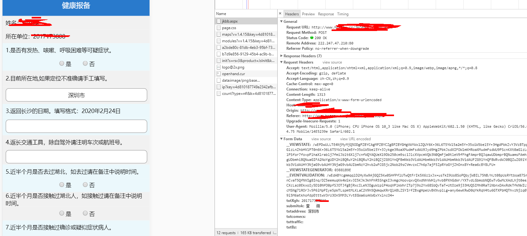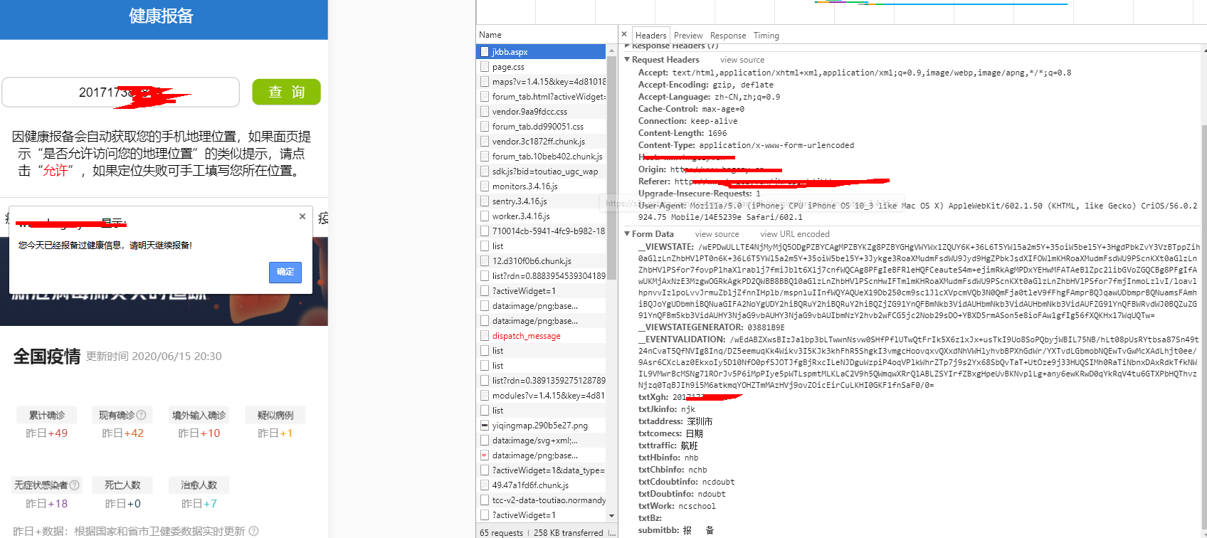 4、我们输入完整的信息之后,点击报备按钮又会发生什么呢?可以看到我们提交的formData信息,请求也成功了(今天我已经报备了,所以是这个提示)。现在整个流程我们已经清楚了,以及请求的参数。那就让我们开始整活吧。