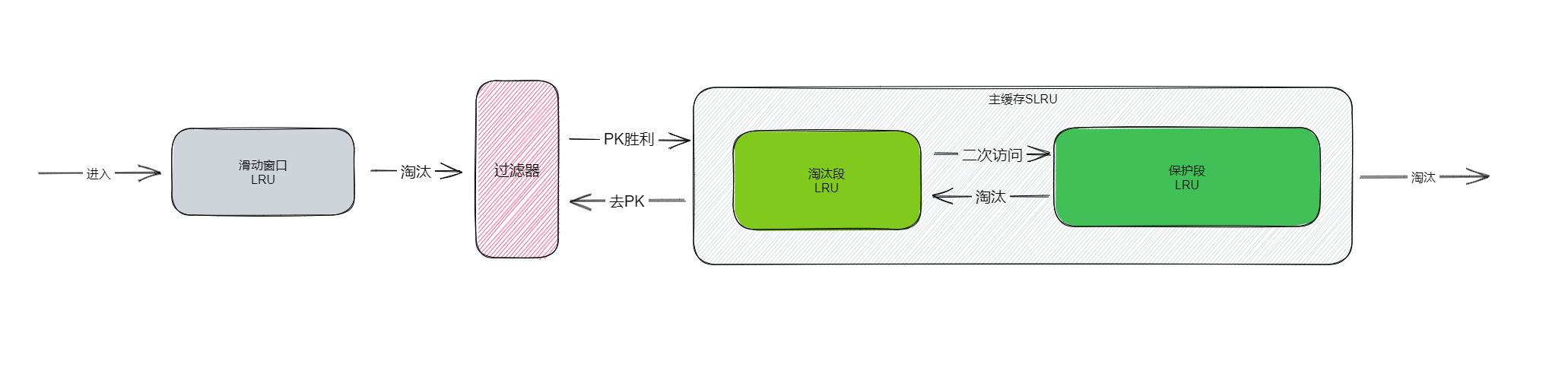 主缓存则采用SLRU策略:元素首先在窗口缓存暂存,当被窗口缓存淘汰时,会与主缓存中最易被淘汰的元素进行频率比较,只有胜出者才能进入主缓存。