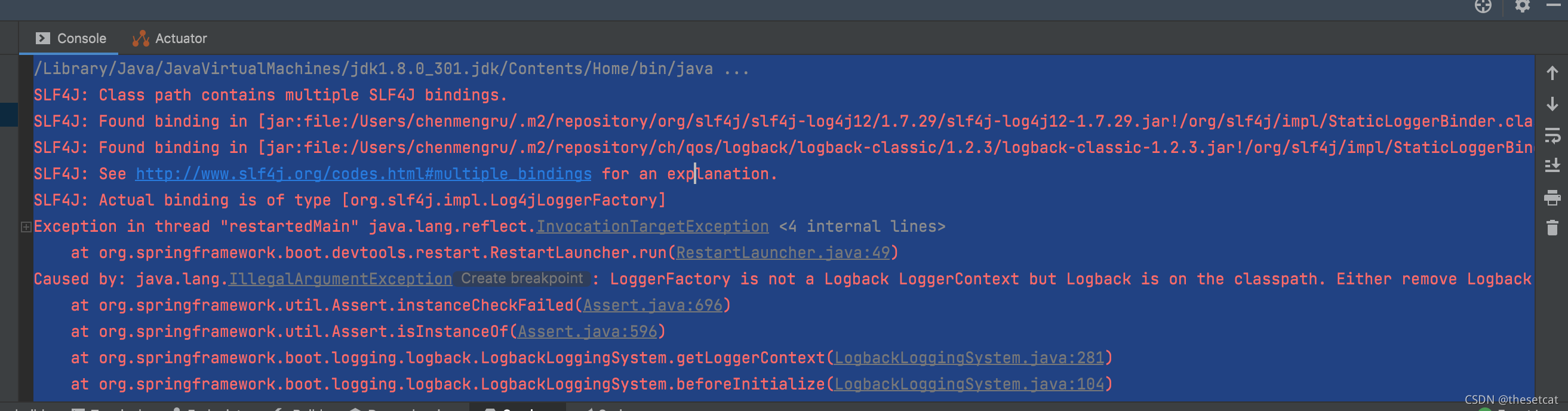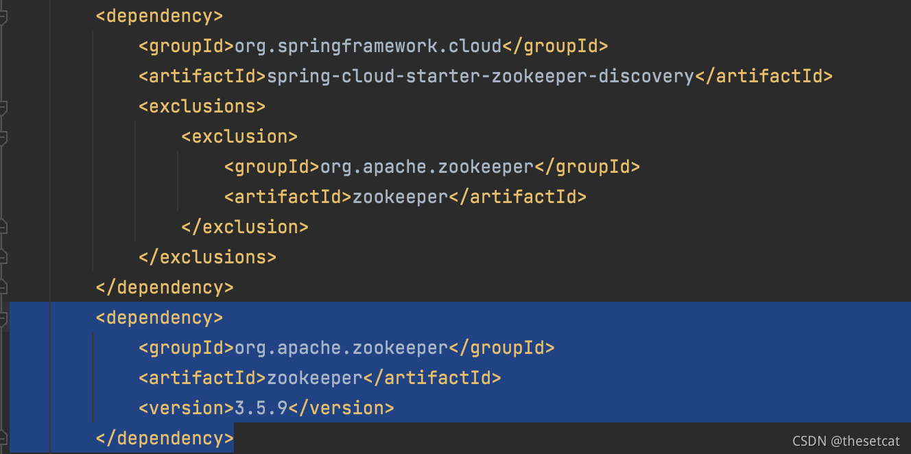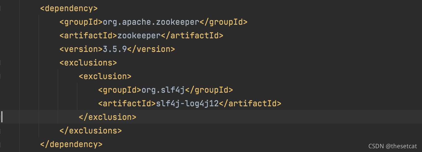 从报错信息中我们可以得知slf4j依赖存在冲突,既然是依赖冲突,我们可以想到,因为增加了zookeeper的依赖后才出现的报错,也就是说在zookeeper依赖中存在slf4j的依赖,所以我们从该pom排除依赖下手