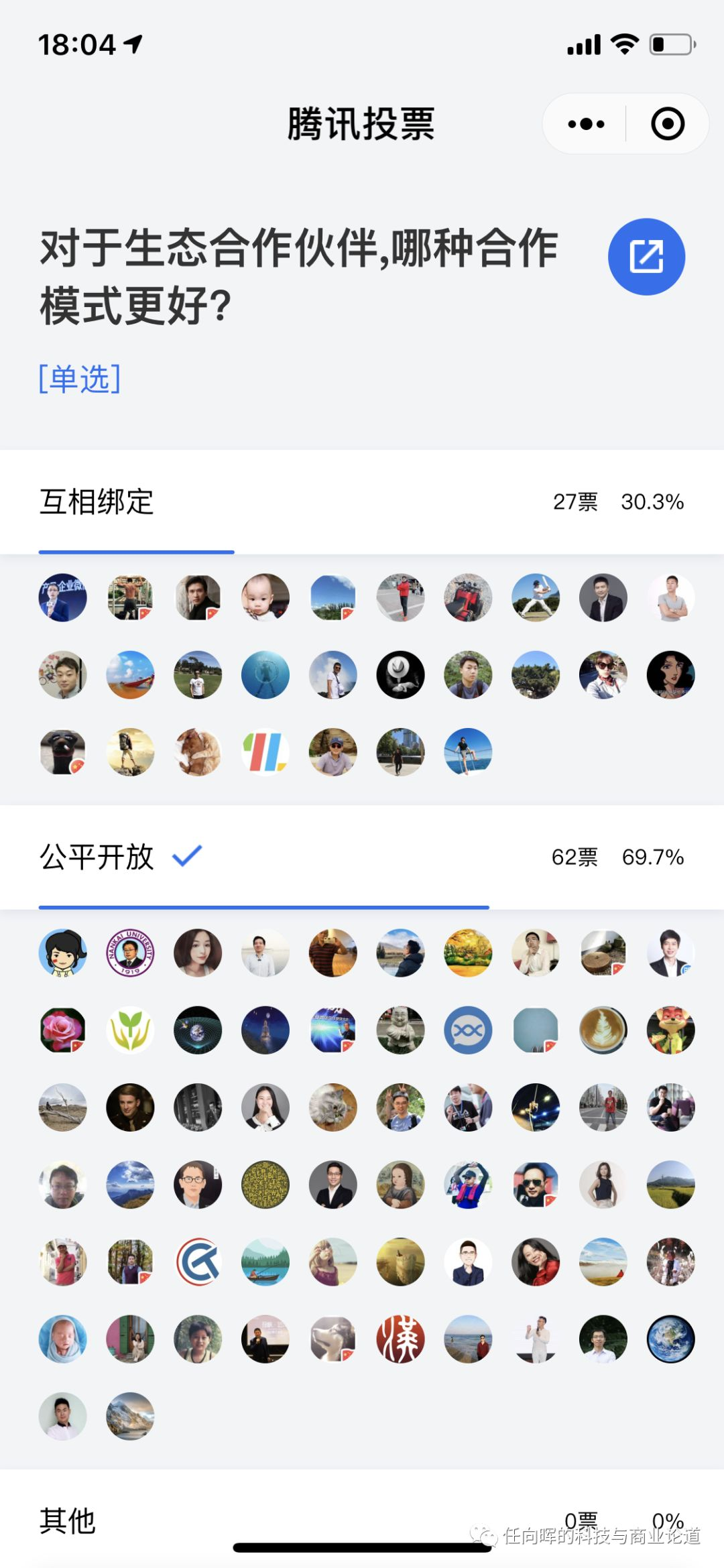 这是一个很简单的问题,“对于生态合作伙伴,哪种合作模式更好?”,是相互绑定,还是公平开放?公平开放明显就是一个人见人爱的褒义词汇,好像就是一个送分题了。