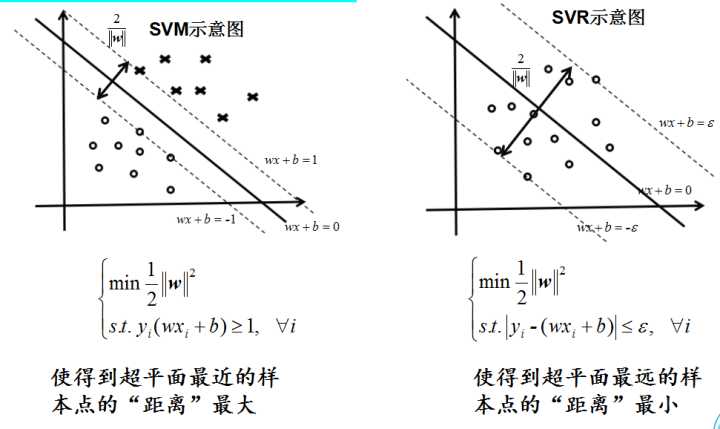 分类是找一个平面,边界上点到平面的距离最远,回归是让每个点到回归线的距离最小。SVM 回归机引入一个 ε-不敏感损失函数作 为损失函数