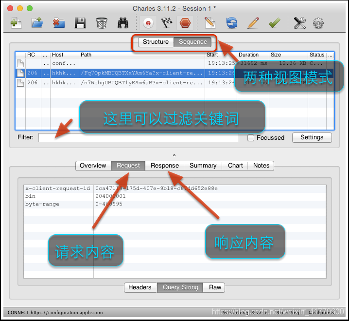 Charles 主要提供两种查看封包的视图,分别名为 “Structure” 和 “Sequence”。Structure 视图将网络请求按访问的域名分类。Sequence 视图将网络请求按访问的时间排序。一般使用Structure视图更多。