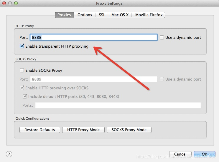 要截取 iPhone 上的网络请求,我们首先需要将 Charles 的代理功能打开。在 Charles 的菜单栏上选择 “Proxy”->”Proxy Settings”,填入代理端口 8888,并且勾上 “Enable transparent HTTP proxying” 就完成了在 Charles 上的设置。如下图所示:
