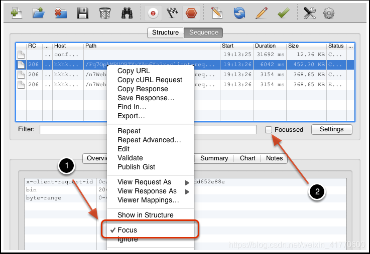 方法三:在想过滤的网络请求上右击,选择 “Focus”,之后在 Filter 一栏勾选上 Focussed 一项,如下图所示:
