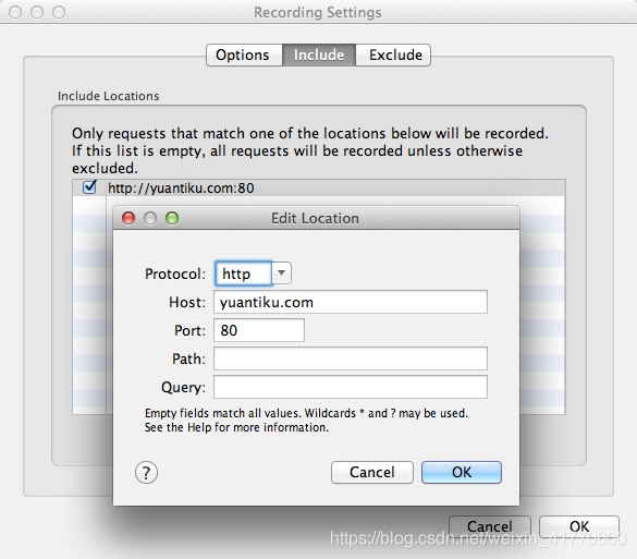方法二:在 Charles 的菜单栏选择 “Proxy”->”Recording Settings”,然后选择 Include 栏,选择添加一个项目,然后填入需要监控的协议,主机地址,端口号。这样就可以只截取目标网站的封包了。如下图所示: