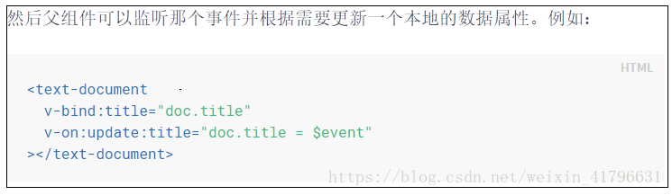 然后父组件中用 v-on 监听 v-on:update:title="doc.title=$event"