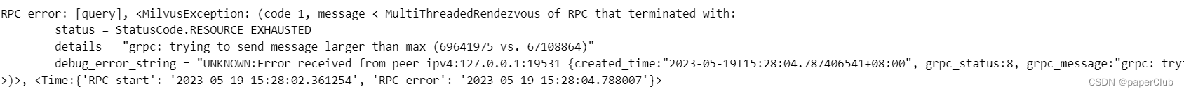 RPC error: [query], <MilvusException: (code=1, message=<_MultiThreadedRendezvous of RPC that terminated with: status = StatusCode.RESOURCE_EXHAUSTED details = "grpc: trying to send message larger than max (69641975 vs. 67108864)" debug_error_string = "UNKNOWN:Error received from peer ipv4:127.0.0.1:19531 {created_time:"2023-05-19T15:28:04.787406541+08:00", grpc_status:8, grpc_message:"grpc: trying to send message larger than max (69641975 vs. 67108864)"}" >)>, <Time:{'RPC start': '2023-05-19 15:28:02.361254', 'RPC error': '2023-05-19 15:28:04.788007'}>