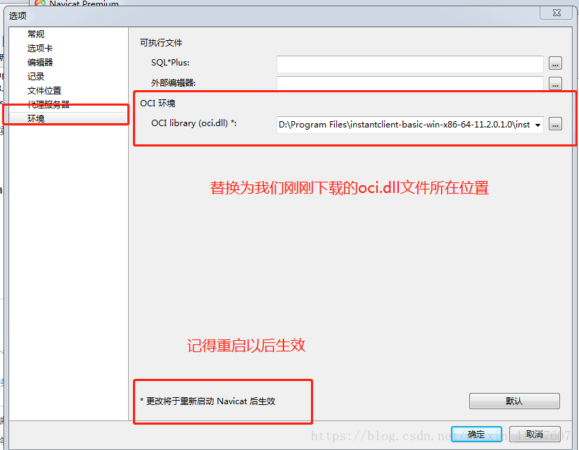 需要替换navciat的选项下的instantclient-basic-win-x86-64-11.2.0.1.0.zip里面的oci.dll ( 当前文件解压到的位置是随意的,但是最好是放在自己不会被随便删除的地方)