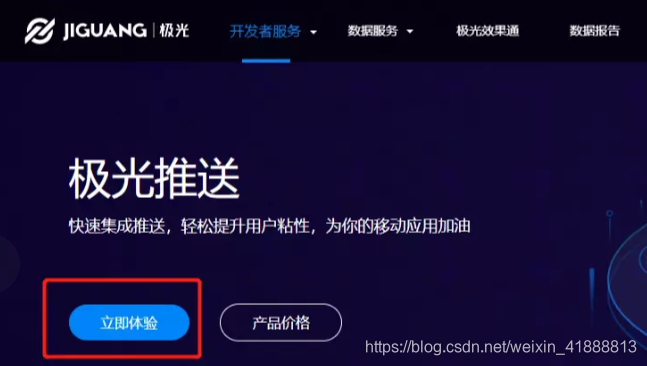 假设你已经注册了极光的账号,登录进来了。点击立即体验,创建自己的应用。