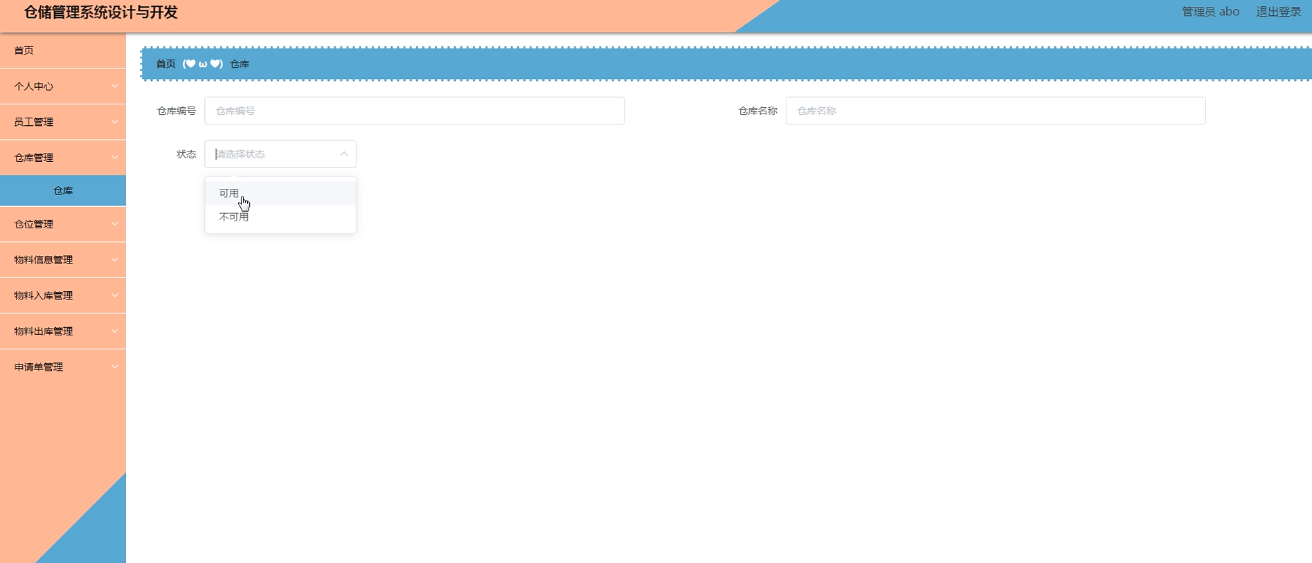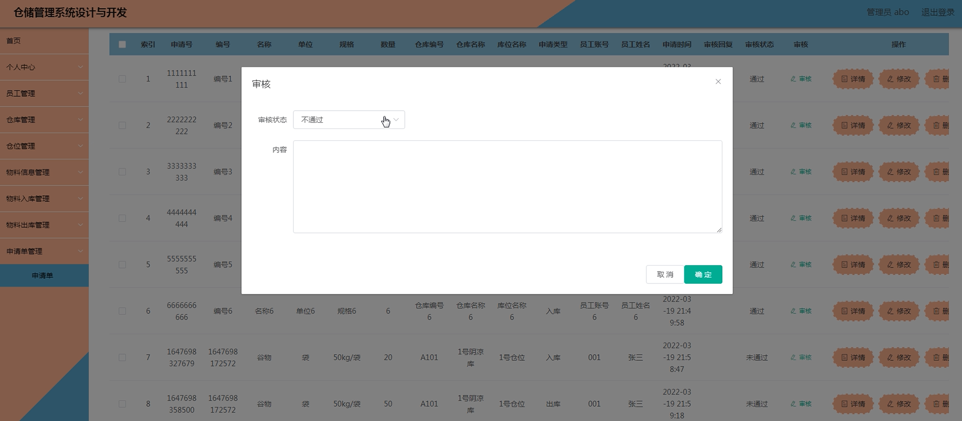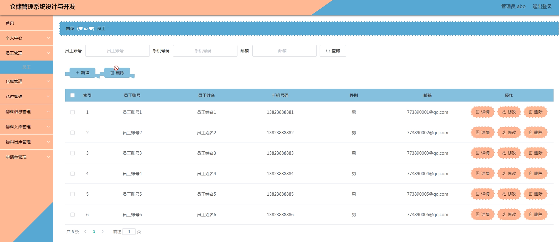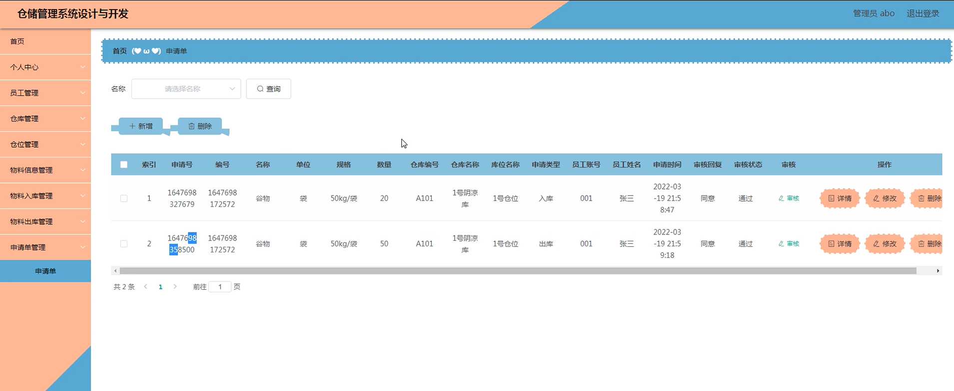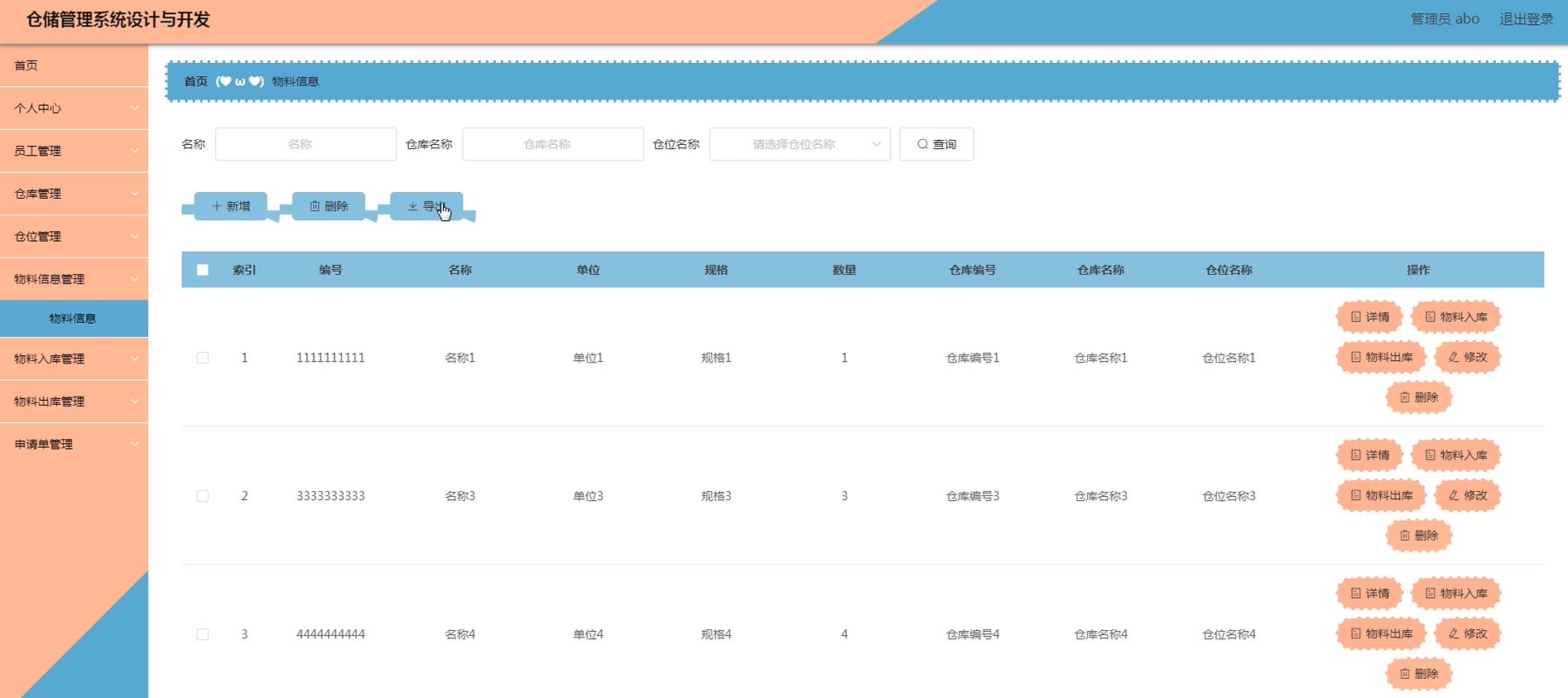 项目功能:物料信息,仓库,仓位,物料入库,物料出库,申请单,员工,操作日志