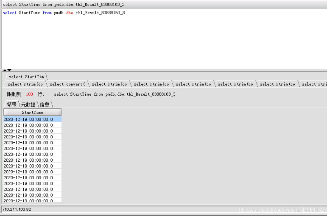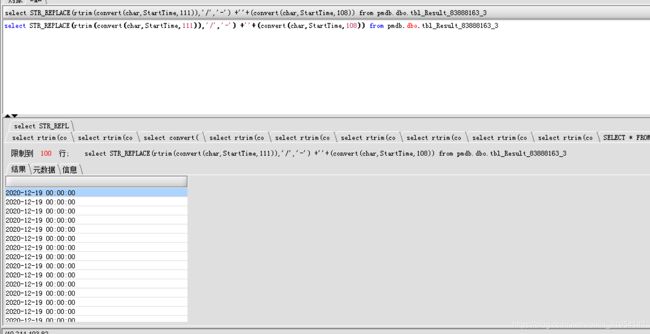 直接贴sql:select STR_REPLACE(rtrim(convert(char,StartTime,111)),'/','-') +''+(convert(char,StartTime,108)) from pmdb.dbo.tbl_Result_83888163_3
